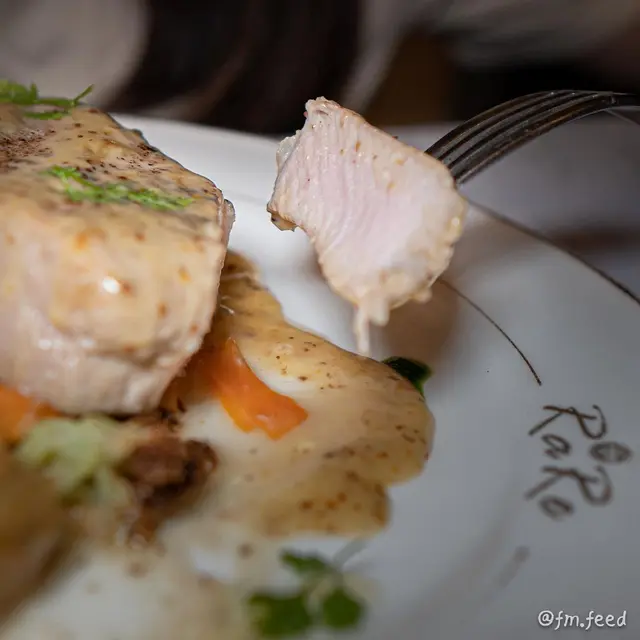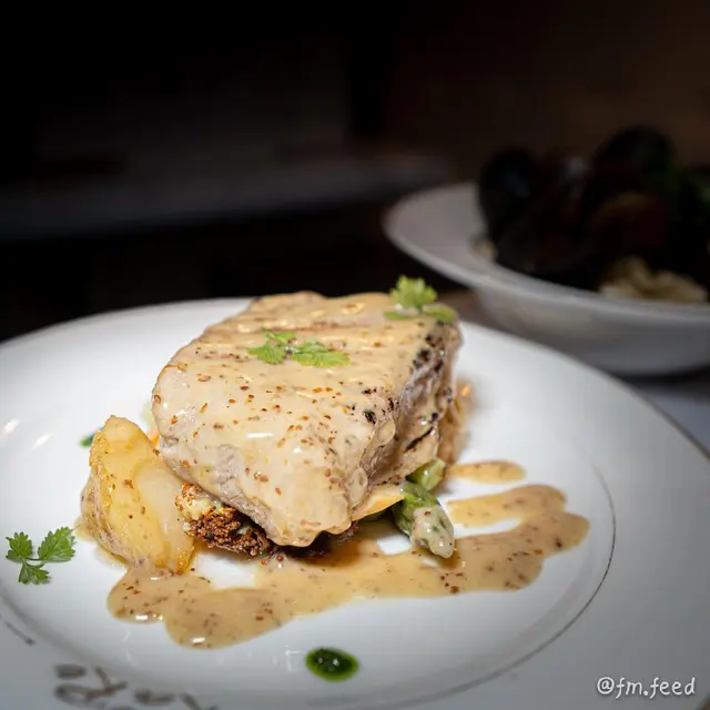青口闊條麵用白葡萄酒、黃油和香草烹製,青口好多隻,鮮甜又惹味。豬肉肉質雪白嫩滑,而且相當厚身,有法式嘅Pommery Mustard Sauce包住食落味道香濃。兩個甜品口感厚實。