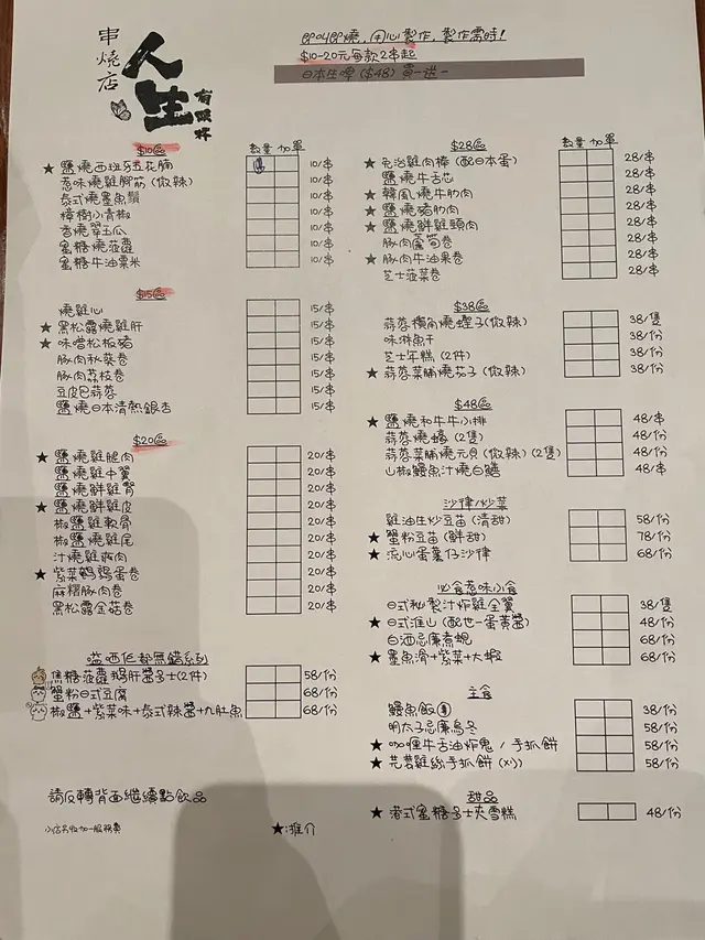串燒用咗價錢去分類,最平$10,跟住就係$15、$20、$28、$38、$48,仲有其他菜式嘅分類。$38已經食到中size嘅燒蟶子。抵啊!