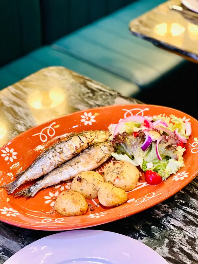香烤沙甸魚是葡萄牙傳統的菜式,三條沙甸魚並列擺放,經炭烤後外皮酥脆,魚肉鮮嫩多汁,稍嫌較多細骨,吃起來有點麻煩。配菜烤薯仔焗得外脆內軟,與新鮮爽脆的沙律配搭得宜。
