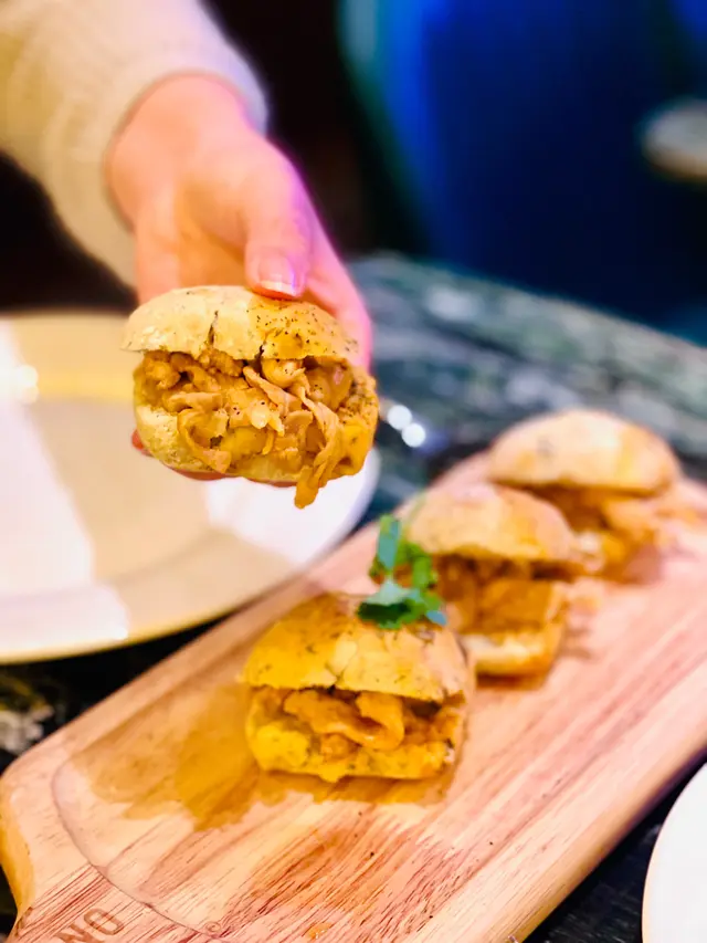 橄欖麵包口感鬆軟,裡面夾著輕輕醃過味的豬柳絲,豬肉柔軟多汁,一口大小作為開胃前菜是不錯的選擇。