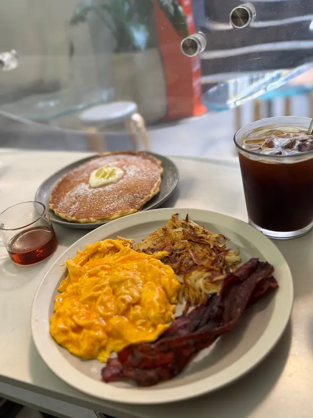 Breakfast Supreme真係豐富到嚇親人!兩塊 Pancake厚身鬆軟,淋上蜜糖,甜度剛好,咬落去仲有微微蛋香。煙肉煎得香脆唔油膩,炒蛋滑溜得嚟帶啲奶香,正!最驚喜係嗰塊薯仔脆薄餅,將薯仔切絲再煎到金黃香脆,外脆內軟,仲有少少焦香,好食到停唔到口!