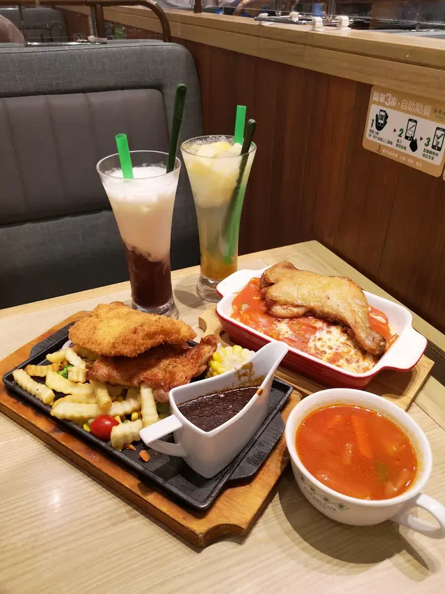雞扒大大塊,吉列魚柳炸粉少少厚,薯條同鐵板不可分割,沾上黑椒汁同茄汁,好味好味。另外鐵板唔夠熱,淋汁落去聽唔到“咋咋聲“。