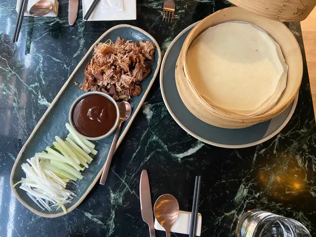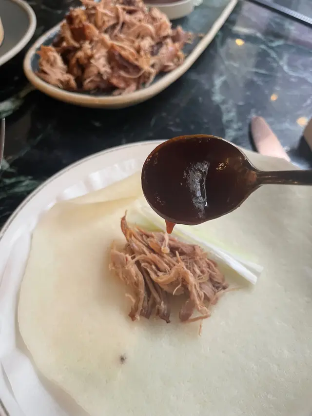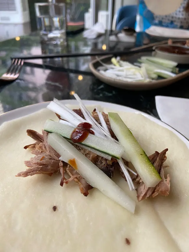將香脆的烤鴨肉、香蔥和青瓜包裹在中式薄餅中,搭配新鮮的裝飾和自家特製醬料。每一口都散發出豐富的口感和美味,鴨肉的香氣與蔥和青瓜的清新相融合。