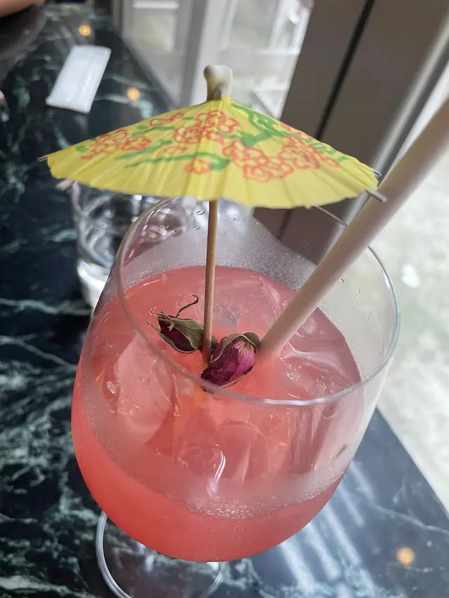 一杯迷人的雞尾酒,淺淺的粉紅色。它以琴酒、荔枝泥、石榴和玫瑰作為原料。這款酒配上一頂細細的紙傘,裝飾得非常可愛。荔枝和玫瑰的香氣交織出迷人的味道。這款雞尾酒🍹帶來優雅視覺和味覺體驗。