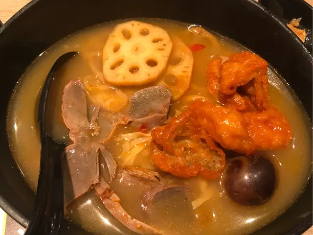 有個抵食的餐,四餸$44仲送嘢飲,我揀咗粗麵、麻辣雞腎、酸齋、滷水蛋、和麻辣蓮藕。粗面冇鹼水味,但係嚟到嘅時候有啲一餅餅,但浸下熱湯就冇事;雞腎好入味,大大件;酸齋好似脆豆卜咁、酸味味夠醒胃;滷水蛋係薑醋蛋嗰種好實果隻蛋(我鍾意呢類型嘅蛋),雖然好入味,但有啲死咸;麻辣蓮藕好爽,超推介!我揀咗清湯加咖喱汁,但係可能我本身啲餸都係辣,結果成碗野真係太辣,搞到我食唔到個辣菜甫,大家要留意,如果唔太食得辣又揀咗辣嘅餸嘅話,就加腩汁好了😜附送嘅係一杯細嘅紫貝天葵,我下次一定會加錢叫大杯,因為真係好好飲又解渴又解辣。