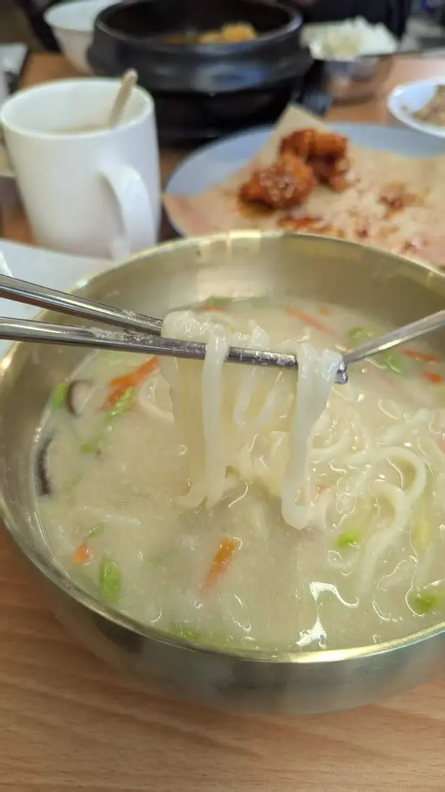 這道麵食較少在香港的韓式餐廳可以點到,以濃稠的湯底為特色,湯色雪白,配料包括冬菇片、紅蘿蔔絲、洋蔥絲和翠玉瓜絲,營養豐富。刀切麵條粗細均勻,口感彈牙QQ,吸收了湯汁的精華,每一口都充滿層次感,飽飽滿足。