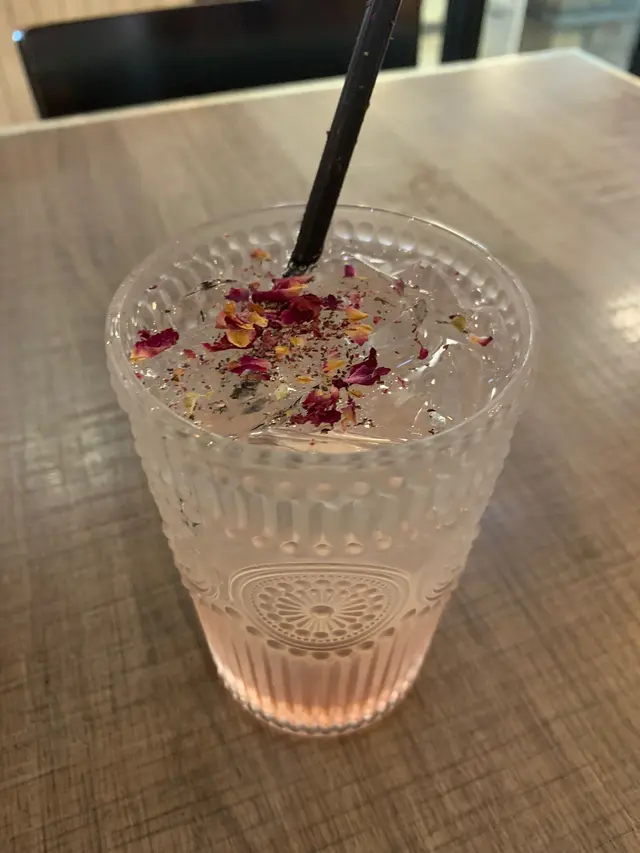 這款梳打不含酒精,帶有粉紅色的飲品,還灑上玫瑰花瓣,女士們最愛。