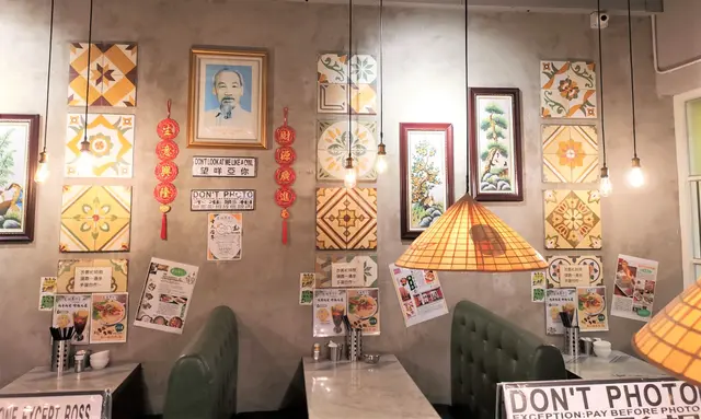 食店的裝潢甚具越南家庭式經營的感覺,燈罩亦仿似越南的竹帽,並以大大個的花街磚作為裝飾。牆上掛了很多有趣的字句,並有大螢幕介紹一些地道食品的製作過程。