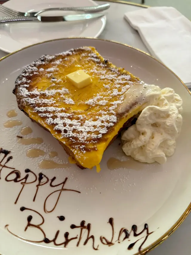🍞 最驚喜係甜品french toast,真心推薦!麵包用牛奶雞蛋浸過,中間超軟熟,入口即溶,比一般港式西多士厚,但感覺反而輕盈得多,蛋香奶香勁突出,食多幾啖都唔覺滯。生日可以叫店員寫生日祝福字句,好貼心,呢個位加分!