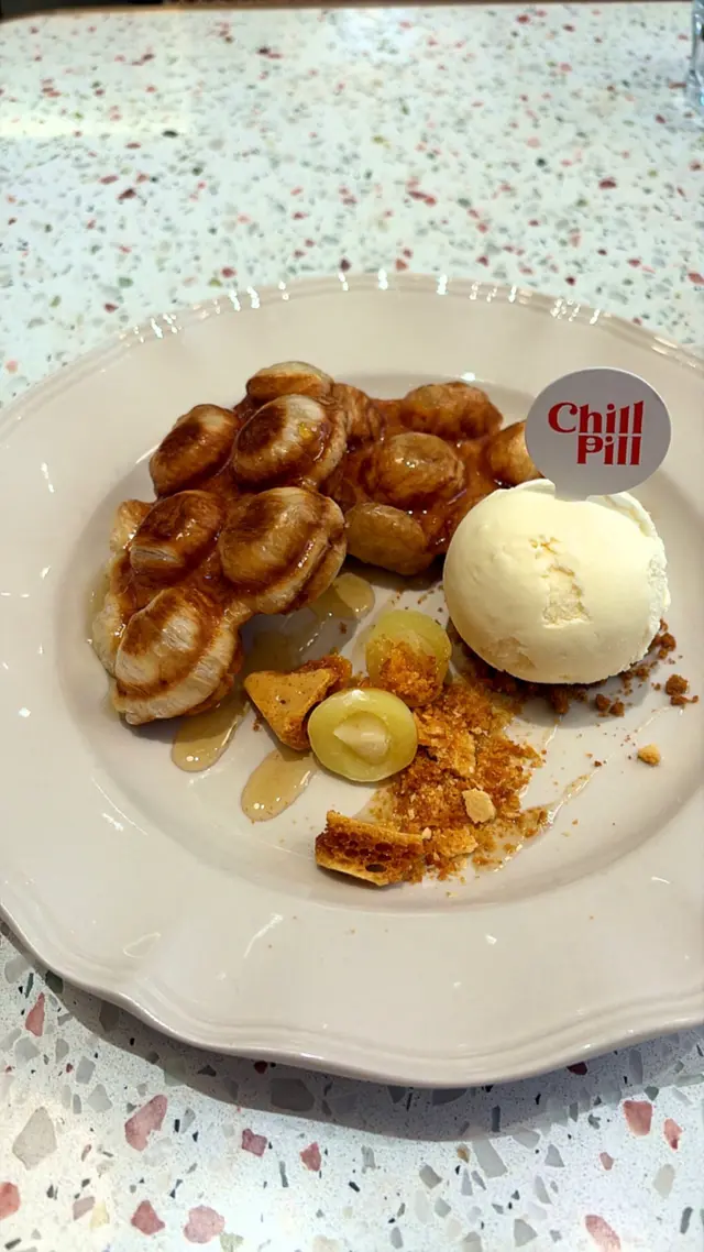 雞蛋仔造型嘅窩夫一上枱已經香噴噴,柚子糖漿清新,配埋焦糖脆餅同雲呢拿雪糕好夾
