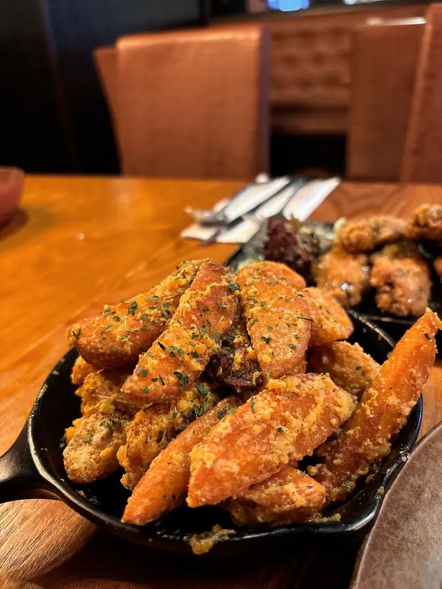 坐低咗就梗係快快脆脆叫嘢食啦!第一樣上枱嘅係鹹蛋黃薯角🍟。嘩!一嚟就聞到勁香嘅鹹蛋黃味🤤,真係未食已經流口水!佢哋啲薯角炸到外層超級香脆,咬開入面仲係熱辣辣、好粉糯嘅薯仔口感🥔。外面均勻咁俾鹹蛋黃包住,嗰種鹹香甘香嘅味道真係好鬼惹味!食落口「沙沙地」嘅口感好正,不過老實講,食得多真係有少少 heavy 同埋漏🤏,但作為頭盤小食,絕對係合格有餘,送酒一流🍻!