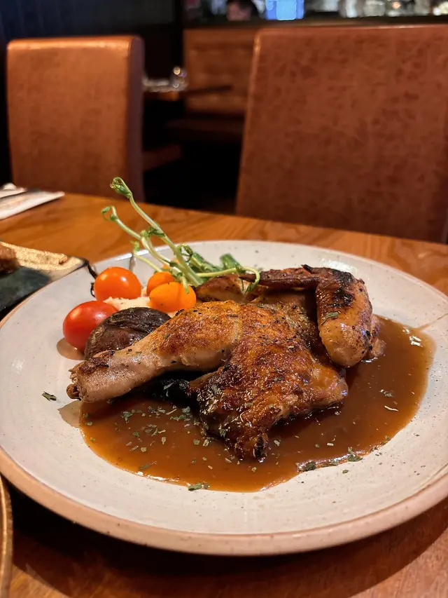 到主菜喇!我哋叫咗香草燒雞🐔。份量都算幾大份,成隻雞脾加雞胸咁滯。雞皮燒到金黃色,賣相唔錯,而且都聞到幾香嘅香草味🌿。切開食落,雞肉大致上都算嫩滑嘅,不過近雞胸嘅位置就有少少🤏🤏乾咗啲啲,如果可以再 juicy 返啲就完美喇。不過整體味道都OK嘅,啲香草味都幾入味,點埋碟邊啲汁食都算唔錯👌。算係穩穩陣陣、唔會出錯嘅選擇啦。