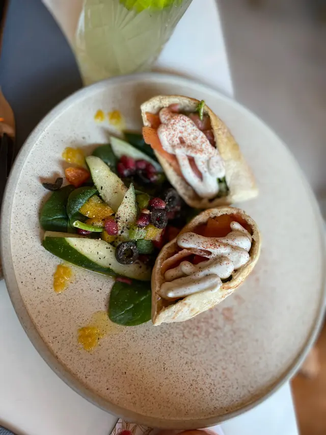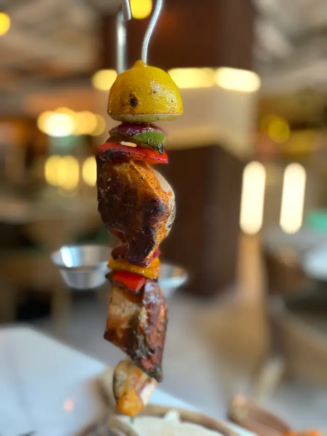 串燒很是吸睛,垂直由上而下串上半個檸檬、吞拿魚、三文魚和大蝦,中間夾着洋蔥和甜椒,對下放上烤皮塔餅,職員端上桌時還溫馨提示小心燙手。食前我們先用手榨檸檬,使檸檬汁由上而下流着,令海鮮加添鮮味。目測吞拿魚和三文魚非常厚身,切開品嚐後表皮微香脆,海鮮嫩滑
