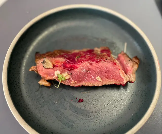要了五成熟的肉眼牛扒,廚師把牛扒切開一片片,伴以野菌、甘筍,沾上紅菜頭醬和芝士醬,牛扒味濃,肉質多汁,十分美味