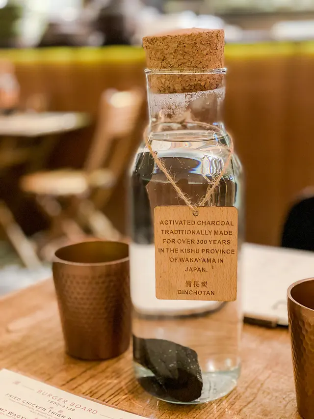 餐廳也準備了備長碳水,備長炭的吸附能力可吸收水中的氯及雜質,並將備長炭內的水溶性礦物質釋放於水中,成為健康的礦泉水。很貼心照顧了健康。
