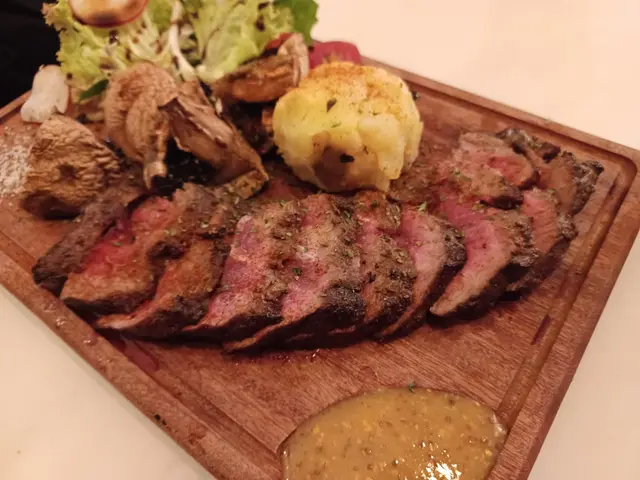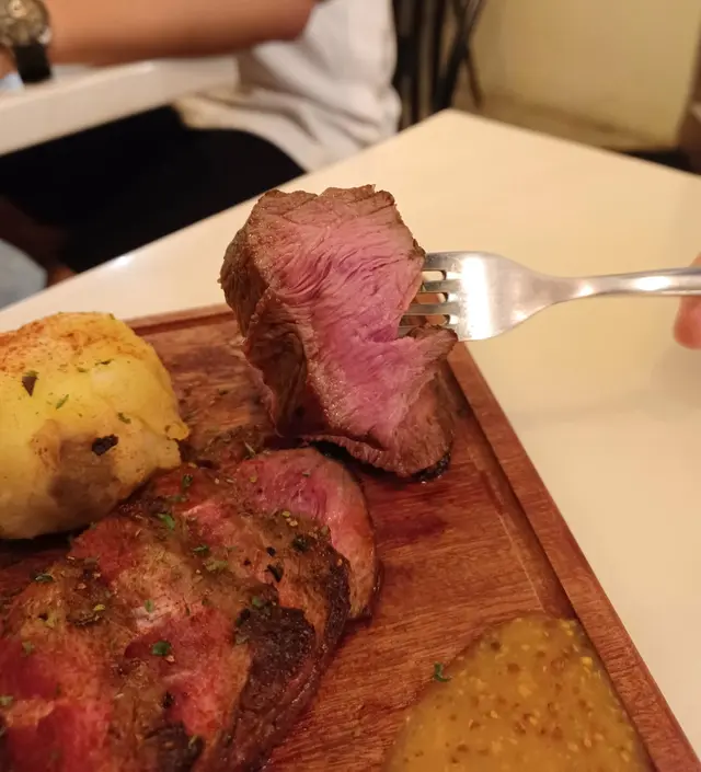 牛板腱外皮烤得香口,裏面肉質粉紅鮮嫩,肉汁豐富,肉味濃郁。配菜有軟滑薯蓉及烤香蘑菇,蘑菇特別香口,口感也不錯。