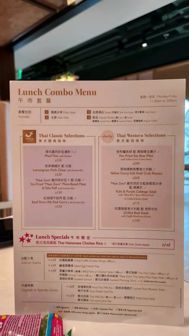 逢星期一至五提供午市套餐, 價錢由138至208, 套餐包沙律、 餐湯、主菜和飲品。加$28 可以轉特飲: 玫瑰泰奶茶、 荔枝玫瑰梳打、 柚子沙冰。