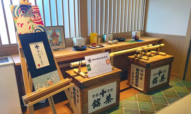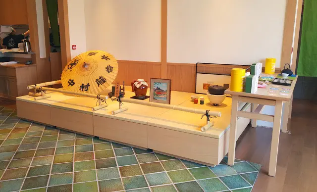 門前的裝飾品: 掛布, 油紙傘, 榻榻米和茶具擺設等, 由舊鋪一一搬來, 一切都依舊, 唯一是取消了學茶道的空間平台, 買"手信"的櫃子也不見了。