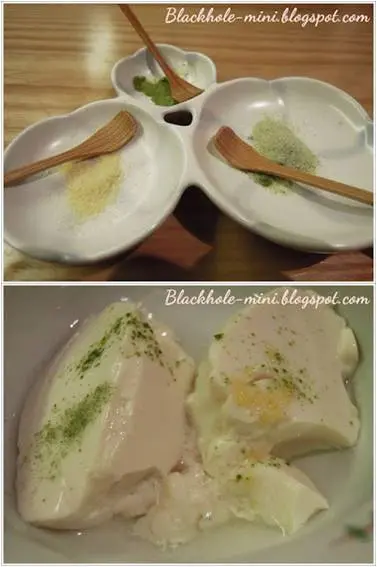 DIY日本濃滑豆腐。店員送來一個裝了豆漿的黑色砂鍋,然後在我們面前把一些透明的凝固劑倒進豆漿裡,再放一個timer在旁邊,等了大概七八分鐘吧,timer終於響了,然後就有一位主管級的小姐替我們把豆腐分到小碗子裡。先純吃一羮豆腐,豆味非常濃郁,豆腐挺身,入口很嫰滑。伴豆腐吃的味粉有三款,分別是柚子、芥末和綠茶,三款之中各有各好,柚子味道清新;芥末味道最濃烈但不嗆喉;綠茶就有淡淡的綠茶香,三款之中我比較喜歡柚子味。我看雜誌的時候明明說是DIY的,結果除了最後加調味粉的這個步驟之外,沒有其他是我們自己做的,不過最緊要好吃。