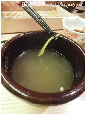 吃完生果之後,有一位店員拿了一個方型的小湯壼來,原來吃完蕎麥麵的鏗魚汁,會加入清湯,然後讓客人把它喝掉。清湯裡面加入了柚子皮,和剛才剩下的鏗魚汁混合成的湯,味道很清爽,不過我不小心咬到那些柚子皮,有點苦。