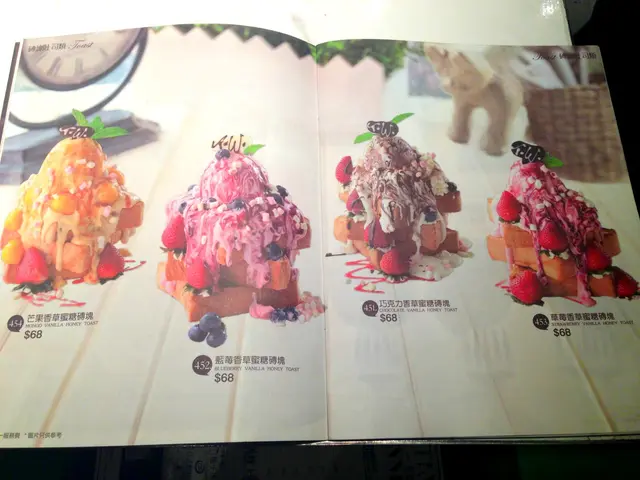 來到晚飯的尾聲,亦是重頭戲!雖然吃過了牛肉麵跟雞排飯都很飽了,但來到這兒沒有不嚐蜜糖磚塊的理由,最後決定了吃藍莓香草蜜糖磚塊。蜜糖磚塊來到的時候很震撼,既有藍莓也有草莓的,整座磚塊高高的,賣相很壯觀,份量十足!疊了三層厚吐司,上面就有一大球忌廉加雪糕,有點熔了的雪糕正在流動,只有三粒開了半邊的草莓,但藍莓的數目不少。