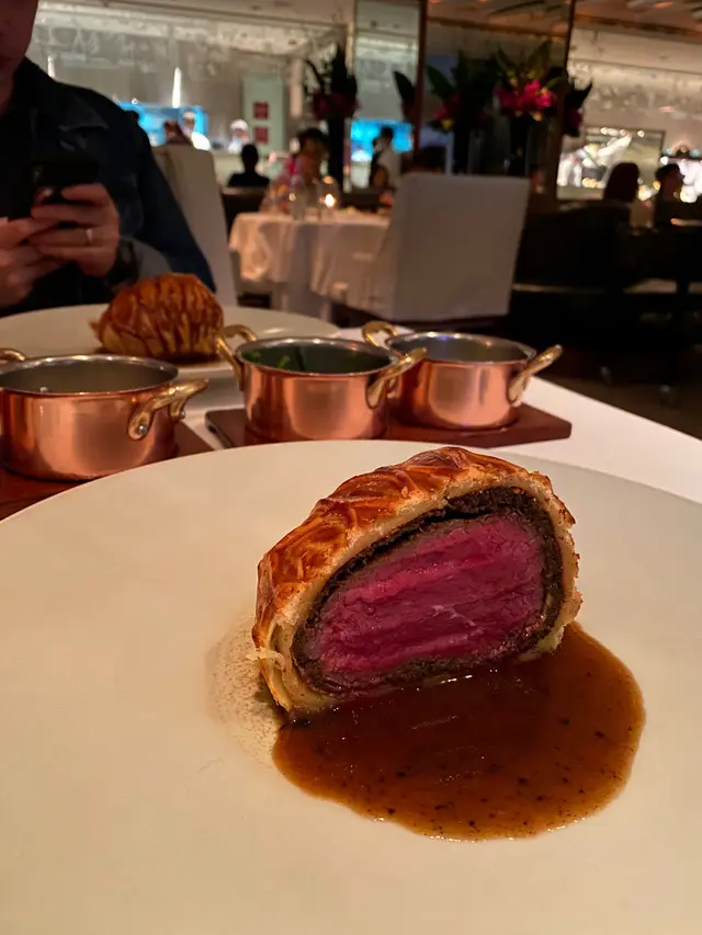 首先講吓佢好既地方,威靈頓牛柳本身係工序好多既菜色,一般都係扒房同西餐廳先會岀現。呢度酥皮焗得金黃,外層乾爽,無濕濕腍腍,切開酥皮又無甩皮甩骨,緊緊包住牛柳,牛柳中間粉紅色,生熟度恰好,又無岀血水,中間夾住既蘑菇醬又厚度平均,