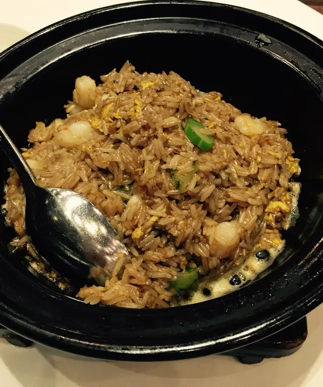 一打開砂鍋蓋,蒸汽冒出,內𥚃的鮑汁仍在沸騰中,令人垂涎。用匙攪拌一下,把鮑汁和飯粒拌得更均勻。材料有大量的蝦肉和珍珠帶子,既爽口又腍身,味道亦鮮甜。米飯似是較優質的絲苗米,每一顆飯粒兩端尖尖的,並有鮑汁味。米飯的份量十足,使我們十分溫飽。