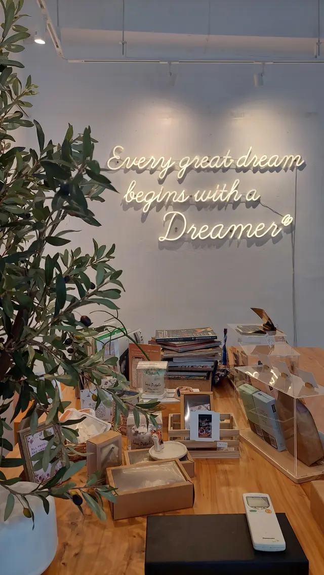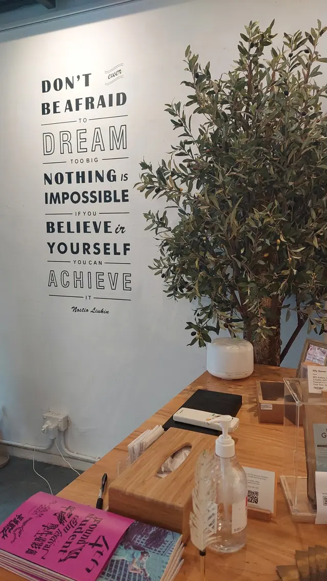 整間店舖以灰色為設計主調,配以有意思的英文句子、青翠的植物和木製桌子,非常型格。望着門外的小路,好像在台北文青cafe嘆啡似的。