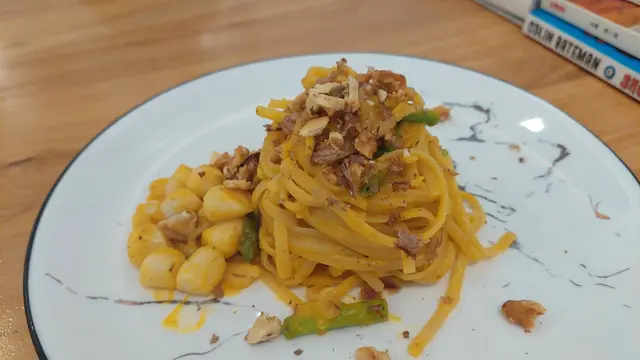 我們點了南瓜汁帶子意粉,當店員端出來的時間,我們有點驚訝,覺得食物擺得比較求其,份量又好似好少,但估不到不揚的外貌,原來是好好味的!南瓜汁原來是真材實料,每啖都有濃濃的南瓜蓉!意大利麵吸收了香甜的南瓜汁,份外美味!只是帶子比較細粒,如能選擇大大粒的帶子就更完美了!