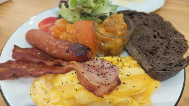 此外,我們點了Deluxe All Day Breakfast。望上去也覺得很普通,沒什麼特別,卻估不到麵包是烘過的,十分香脆!麵包旁邊放了一杯黑黑的Apple Earl Grey Jam,我們以為只是普通的果醬,吃了一口,不得了呀!原來非常好吃!酸酸甜甜的,配以淡淡的Earl Grey,是整碟ADB的精粹和靈魂!其他配菜如香腸和煙肉,都煎得十分香脆惹味,炒蛋也炒得很香滑!這碟ADB殊不簡單,絶對不是粗製濫造的,吃得出是廚師誠意之作!