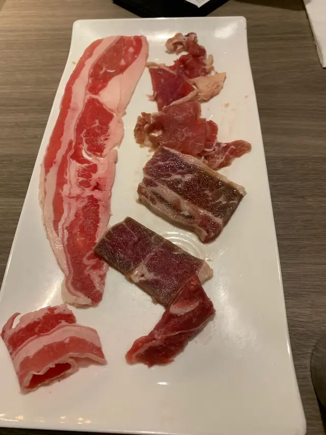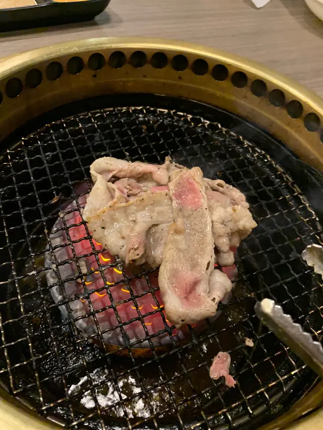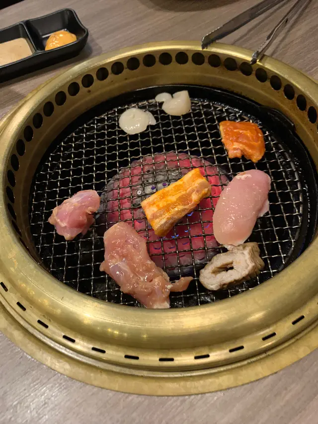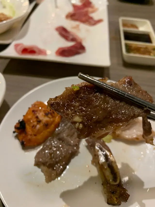 好,正式開燒!我同男友食勻牛肉雞肉豬肉,男友最鍾意嘅係牛仔骨,聽聞近骨嘅肉係好好食,此言不假,牛仔骨經過鐵板炙燒,肉香濃郁,仲可以食埋骨邊薄薄一層牛筋膜,口感好正。