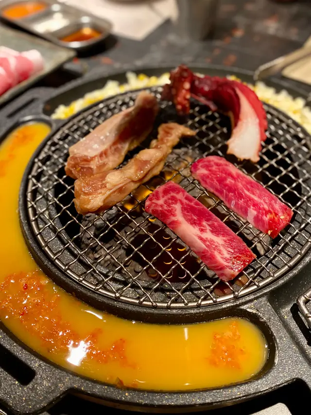 套餐包晒海陸兩味:大八爪魚鬚、牛小排、豪快嚴選牛舌、濟洲五花肉、醬油豬排骨肉。質素普通,無論牛肉豬肉嘅肉味都屬於中上水平,八爪魚鬚彈牙肉脆。我最鍾意係五花肉,燒到焦黃色,再剪開細塊,點少少汁再加泡菜,包埋生菜食好正!