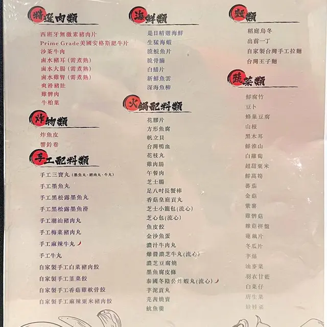 除左牛肉同豬肉,仲有好多火鍋配料選擇。海鮮,炸物,手工配料,蔬菜,麵類,甜品,雪糕...... 全部都無限追加,QR code落單就OK。花多眼亂,豐富!