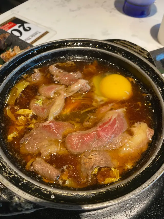 小食唔夠飽,仲叫咗牛肉壽喜燒,上菜時有隻生雞蛋,攪勻同牛肉一齊食濃味好多