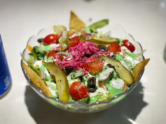 好色彩繽紛 有生菜 橄欖 青椒 紅蘿蔔 酸青瓜 車厘茄 炸脆片等等 係一個唔錯嘅開胃菜