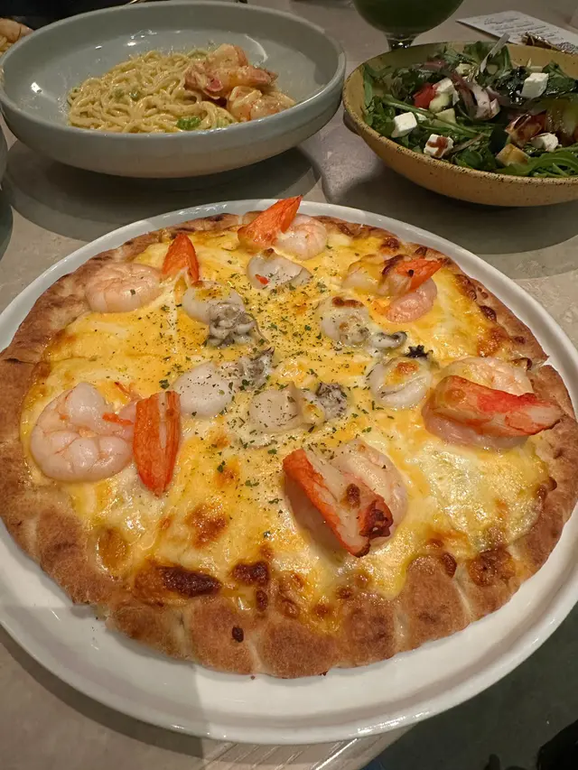 今次揀咗千島海鮮薄餅🍕上面有墨魚、蟹柳、超爽嘅大蝦,濃濃嘅芝士同海鮮醬令到薄餅非常Juicy,三個人食啱啱好!