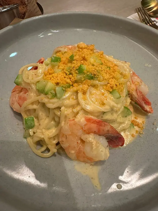 另一個係比較濃味嘅金沙鹹蛋黃鳳尾蝦意粉,蝦肉好爽,鹹蛋黃味道夠晒濃郁,亦唔係好多地方可以食到~加埋鮮味嘅大蝦🍤,係我每次去牧羊少年都會食嘅意粉~