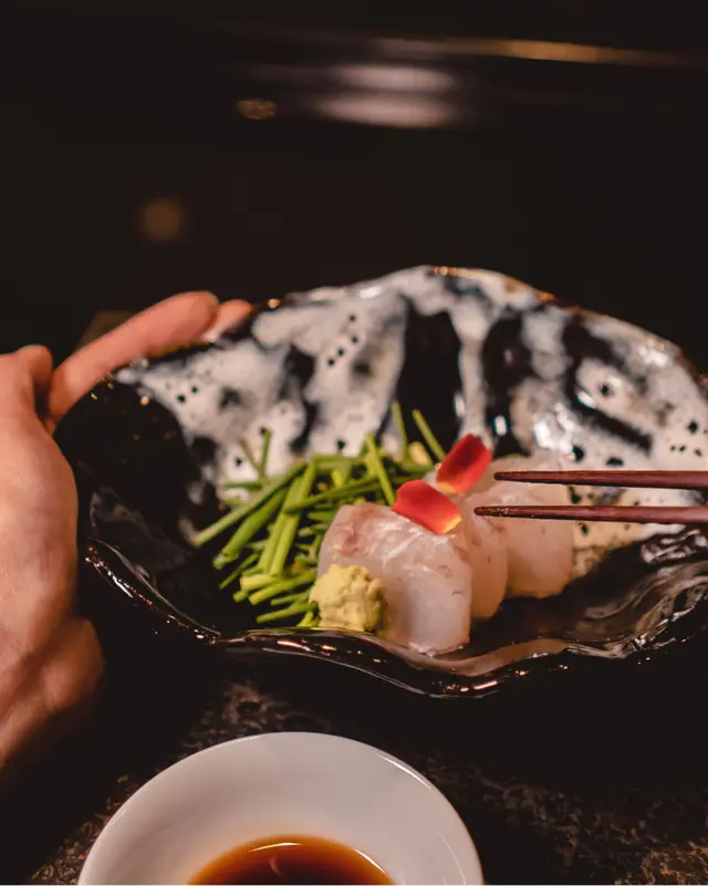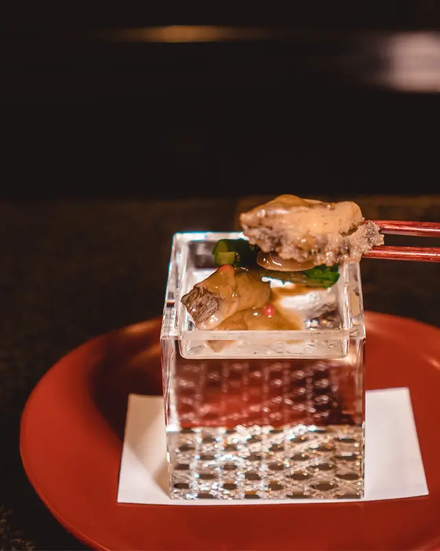 𓇢𓎦 北海道蒸鮑魚 右口魚昆布 安岡河豚蔥 帶子醬油 Steamed Abalone&Flounder Kelp Sashimi with Yasuoka Fugu-Negi & Scallop Soy sauce