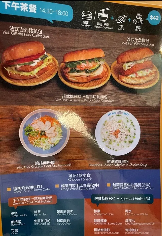 前幾日去左佐敦拎証書,之後就係附近揾間餐廳嘆個下午茶醫肚,行行下就見到呢間食越南野既餐廳,見有法式豬扒包就入去試下。 下午茶餐算幾低食,一個豬扒包加一款小食再加埋飲品都係$42, 轉特飲先加$4, 真係平靚正。