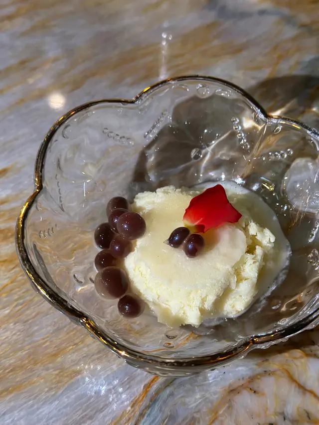甜品-是柚子雪葩,搭配自家製的分子料理紅豆爆珠,新奇有趣,比利時的食用花瓣點綴,增添了視覺上的美感😆