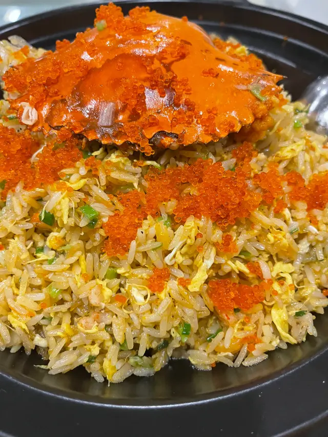 炒飯內有淡淡蟹肉、蟹子、少少蟹膏仲有少少鹹魚、蛋及姜、炒飯炒得非常乾身👍而且啲飯唔會一嚿一嚿、全部炒到一粒粒好分明👍而且啖啖蟹肉同埋蟹子味😋😋😋加上沙窩上、非常香口出色👍返來加咗少少姜、可以除去蟹肉嘅腥味同埋可以驅寒👍