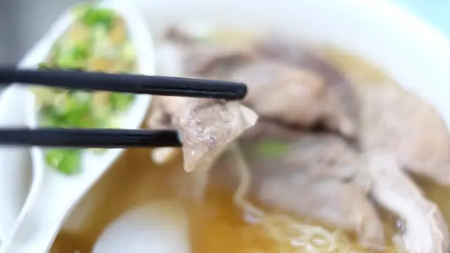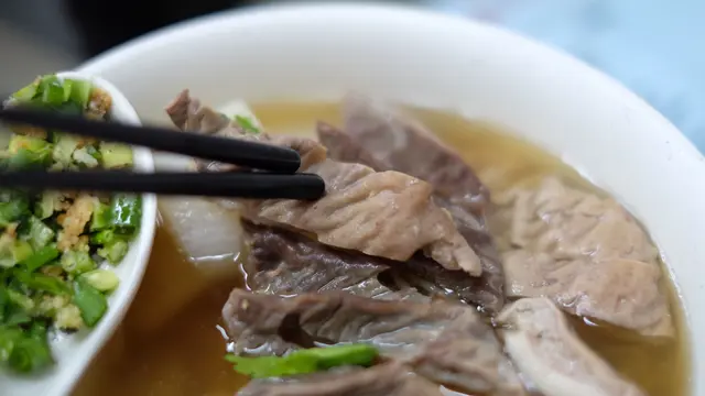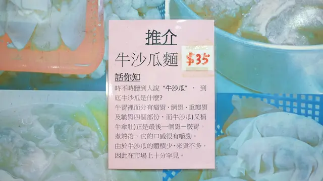 牛沙瓜的紋理清晰,面層呈摺紋而背面平滑。入口味道沒有牛腩那種爆炸性味蕾的震撼,比較含蓄。入口比較爽口,咀嚼不是咬不斷的質感,但的確要點耐性。眼看內臟亦處理得乾淨。而麵身方面,亦乾身爽口,沾上浙醋中和一下鹼水味。