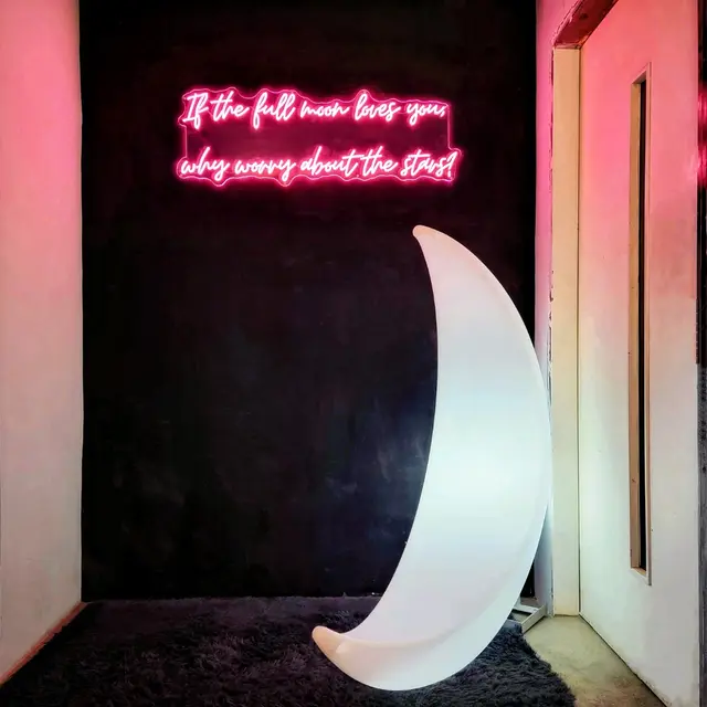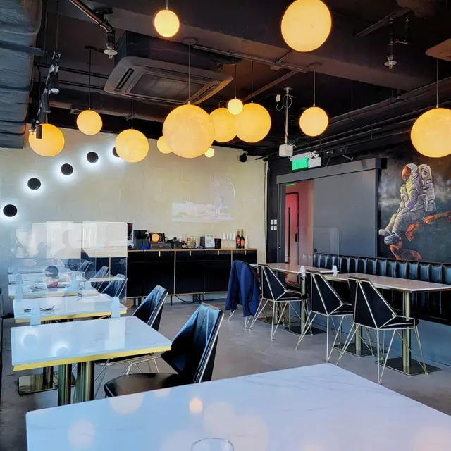 餐廳以亮白為主調,天花吊滿大大小小的月亮燈,2排大窗飽覽城景及海景,感覺開揚放鬆。牆上有文案燈牌,太空投影及太空人畫作,門外更有大型彎月攝影棚,處處都是打卡位。