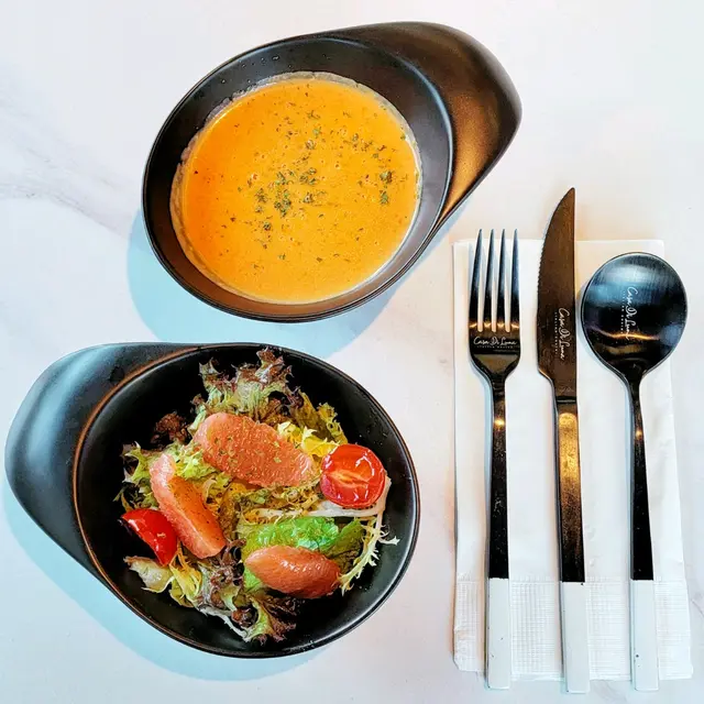 是日餐湯是蕃茄濃湯,熱辣辣的稠度適中,滑溜中又可嚐到一些洋蔥微粒,增加了層次感,味道酸酸甜甜的不會太飽膩。沙律菜新鮮脆綠,配搭柚子汁及西柚清爽醒胃。