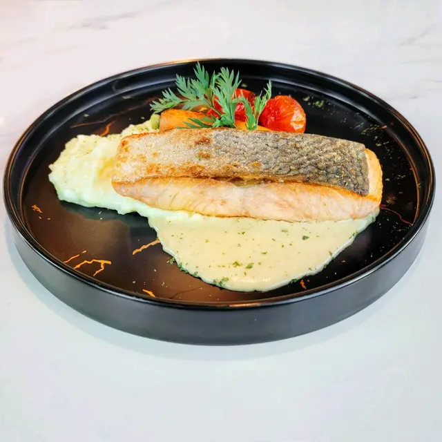 三文魚不算肥美但煎得剛剛好,不會太乾太柴,蘸些紅花忌廉汁同吃更能突出魚的鮮香。魚皮完整微焦,薄薄帶點脆,配菜薯蓉滑溜帶牛油香。