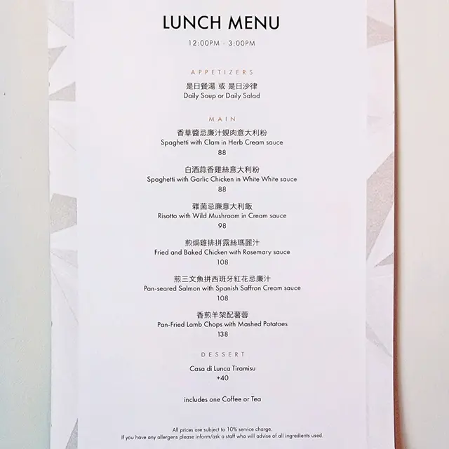 在現行防疫規例下,餐廳4月21日前只提供6款午市套餐,由12 :00至17 :00都可享用。三道菜午餐價位由$88至$138,有雞、魚、羊架、意大利粉/飯可選,加$40還可配上精緻甜點。