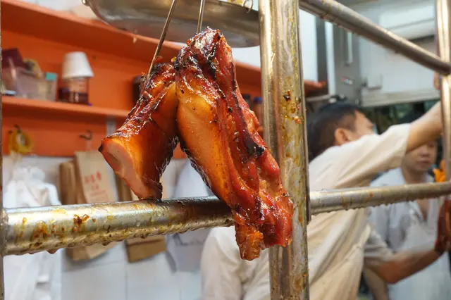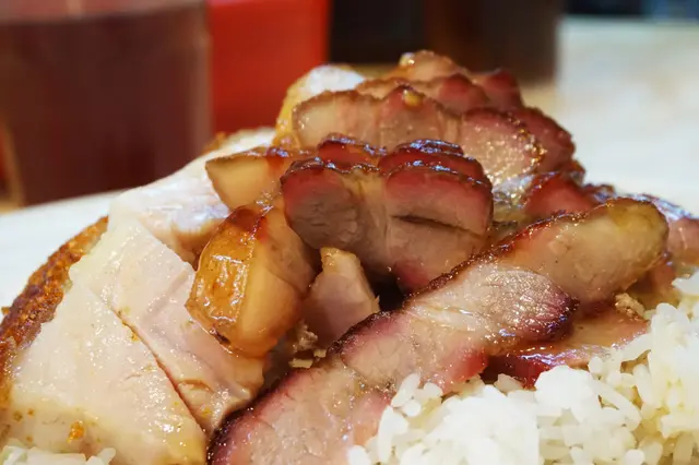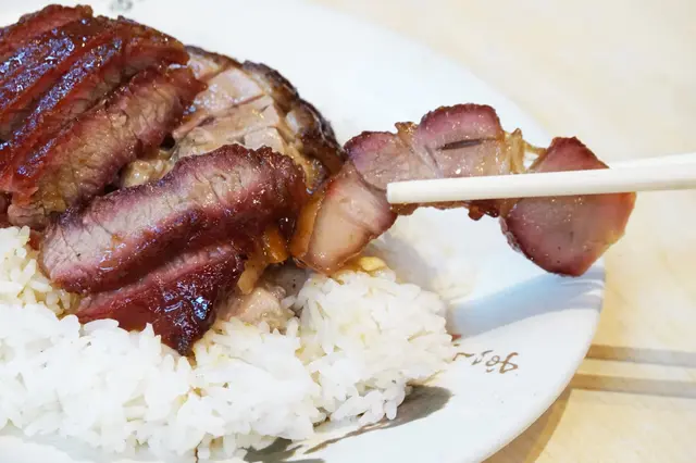 友人說燒肉表現平平,皮夠脆但瘦肉位太少,但叉燒是如期望中的好。一天能賣上二百條叉燒,絕非浪得虛名。沒有特別要求下,給予半肥瘦的叉燒,為數七至八片,夠拌飯。不見俗稱「火雞位」的燶邊,但在燶邊附近的偏肥而爽口的部位仍在。表面醃得深紅,顏色只滲透到肉裡的幾毫米,中間仍保留粉嫩明澈的天然淡肉色。蜜汁沾得均勻,不甜膩不粘牙,但蜜香豐腴。粼粼的深紅下,肉質紋理細緻,夾雜著均勻的脂肪層,好比在西餐廳吃的黑毛豬的完美肉質。這裡用上新鮮脢頭肉,鬆化而肉香滿滿。最邪惡的莫過於蜜香緊鎖上下的兩端脂肪組織,咬下盡是甜美的脂香,比燒肉那相對味寡、平平無奇的脂肪層,引人入勝得多了。
