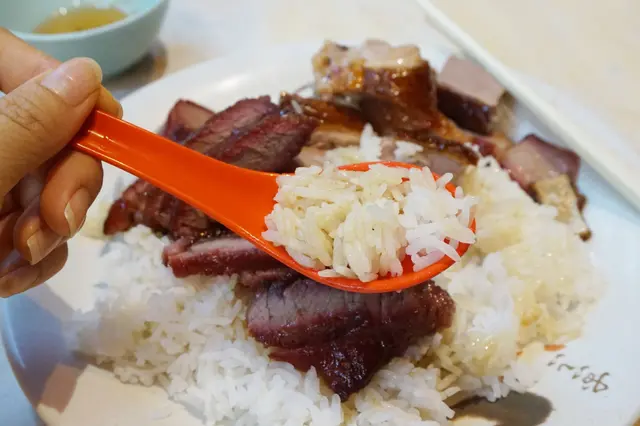 一客叉燒燒肉飯,一客叉燒燒鴨飯,雙雙奉桌。前者是正常飯量、正常叉燒,後者是少飯、偏瘦叉燒。一條青菜都沒有,就是坦蕩蕩的肉和飯。嘗試在邪惡晚餐之中找點變奏來安慰自己,瘦點的肉、少點飯,還是逃不過沒有菜吃的事實。「又要威又要帶頭盔」,又要吃又要怕胖。女生就是這樣忸怩,嘲笑我兩秒好了。