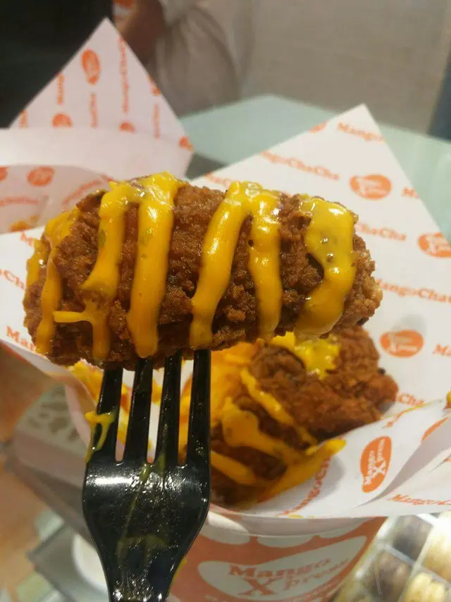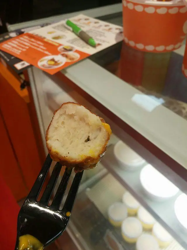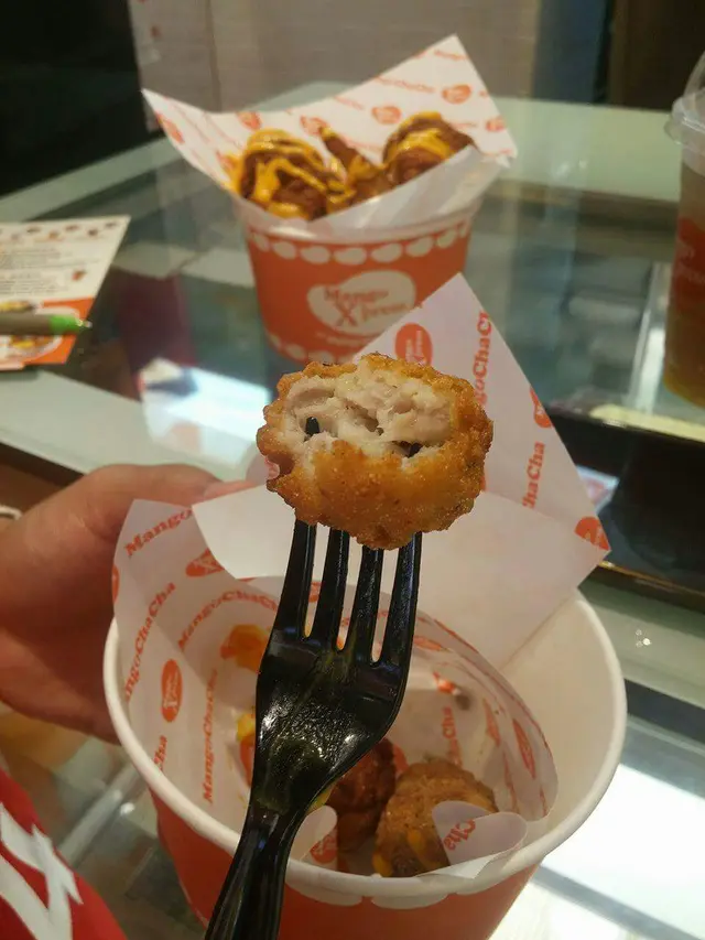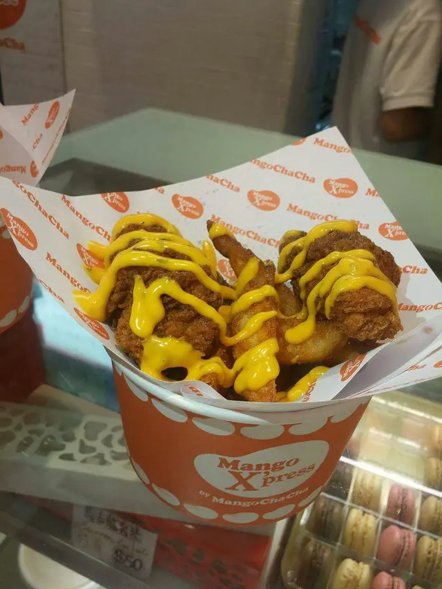 炸雞拼椒鹽花枝丸,醬汁來落好特別!原來係芒果芥末醬,食落冇蜜糖芥末醬咁甜