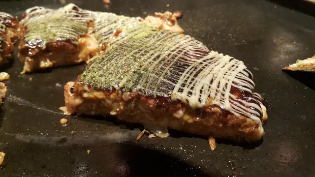 成個畫面比大阪燒豐富好多! 但整既過程亦多好多!先落一殼粉醬做好個餅底, 放上個兜咩都有D既材料, 跟住放椰菜後好似要加粉醬, 豬肉佢張圖係圍住菜我就鋪左係上面, 跟住要將呢齊舊野反轉煎熟豬肉。呢個步驟要D菜唔好飛出黎我覺得係要補粉後壓一壓D菜等佢俾粉醬痴埋, 反既時候就無咁易飛菜出黎了。